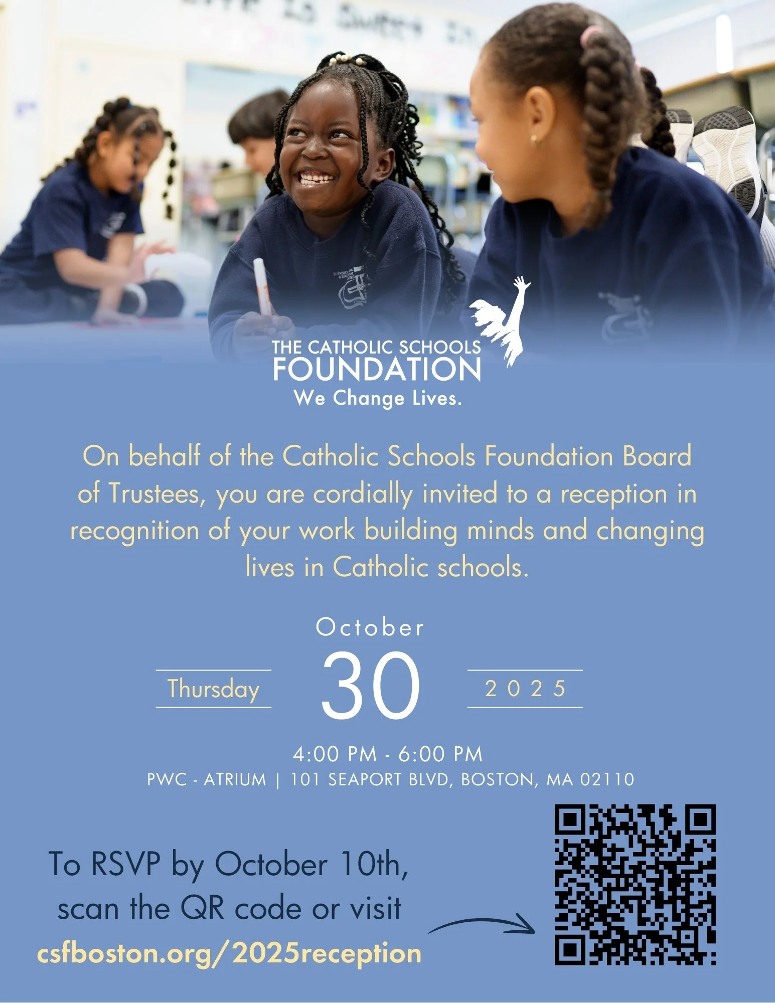 On behalf of the Catholic Schools Foundation Board of Trustees, you are cordially invited to a special reception recognizing your dedication to building minds and changing lives in Catholic schools.