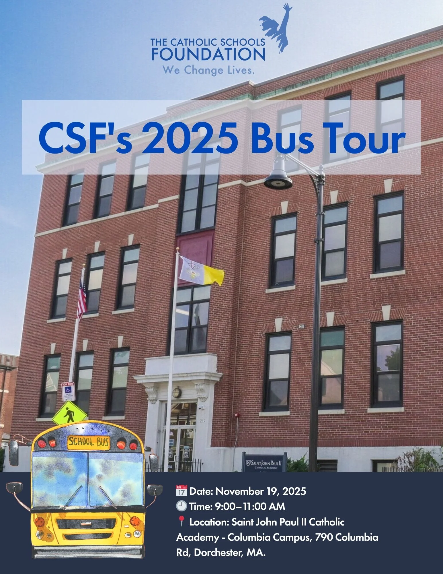 On November 19, 2025, from 8:00–11:00 AM, join CSF at Saint John Paul II Catholic Academy, 790 Columbia Rd, Dorchester, MA for our next stop on the CSF Bus Tour. Guests will experience the impact of a Catholic school education through student-led tours, followed by a community breakfast. Don’t miss this opportunity to see firsthand the difference our schools are making every day.