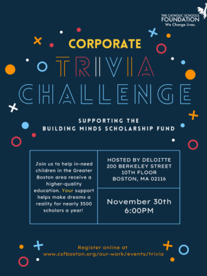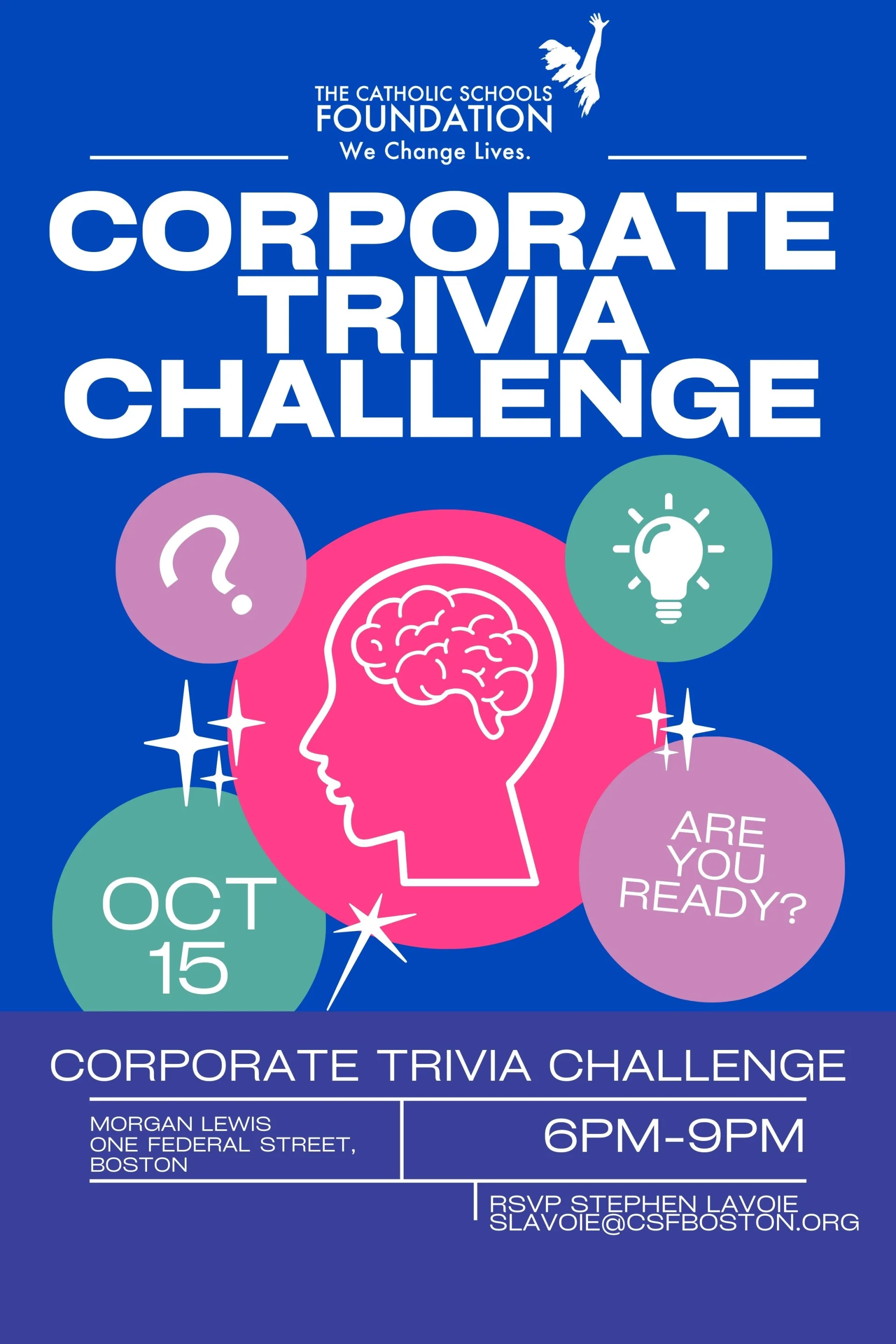 Join Us for the 2025 Corporate Trivia Challenge! Test your knowledge and compete for bragging rights at CSF’s Corporate Trivia Challenge, hosted by Morgan Lewis on October 15, 2025, from 6:00–9:00 PM at One Federal Street, Boston.
