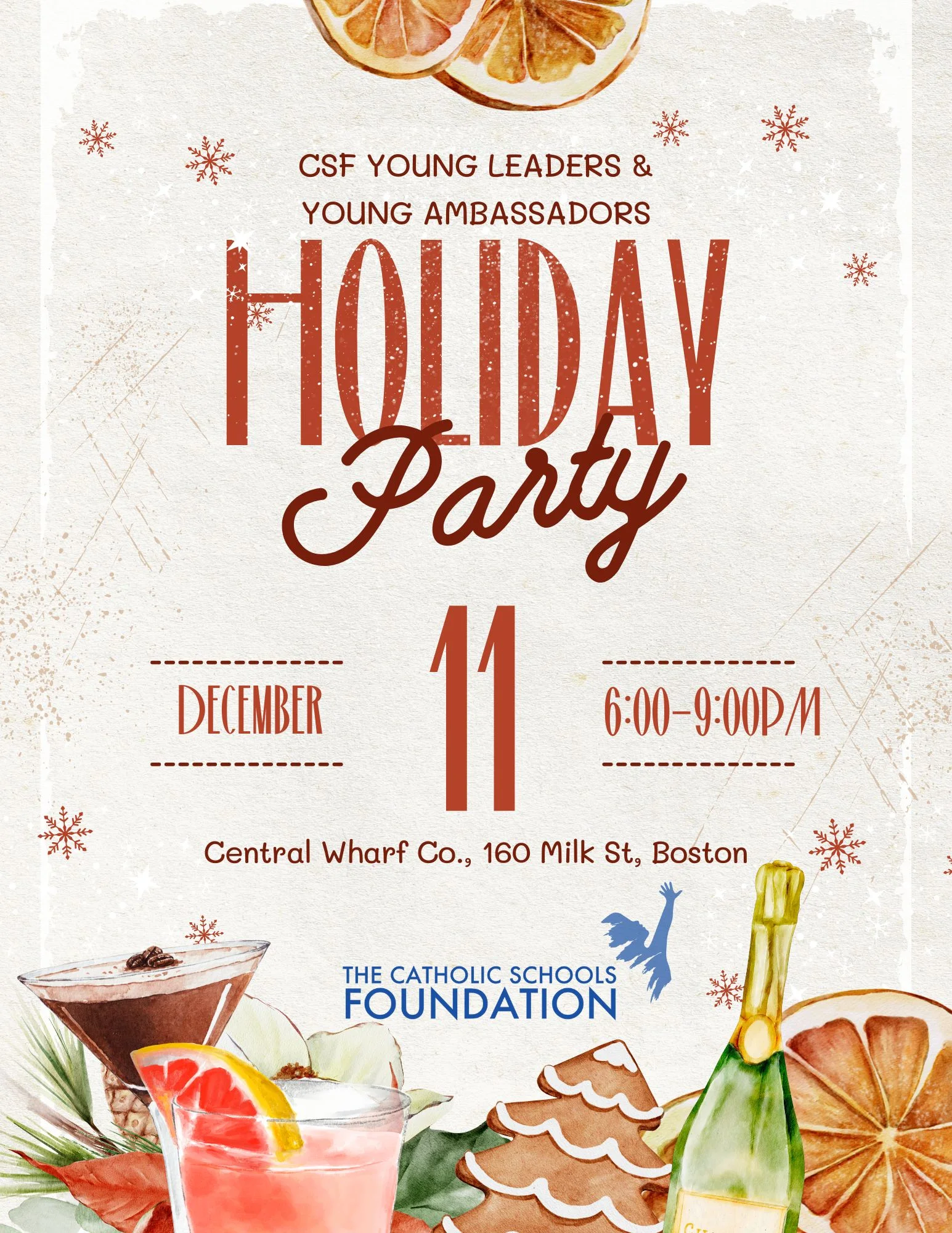 Join us for the CSF Young Leaders & Young Ambassadors Holiday Party on Thursday, December 11th at Central Wharf Co. Celebrate the season, connect with fellow alumni, Young Leaders and supporters; and make a difference by bringing a canned good for our holiday food drive!
