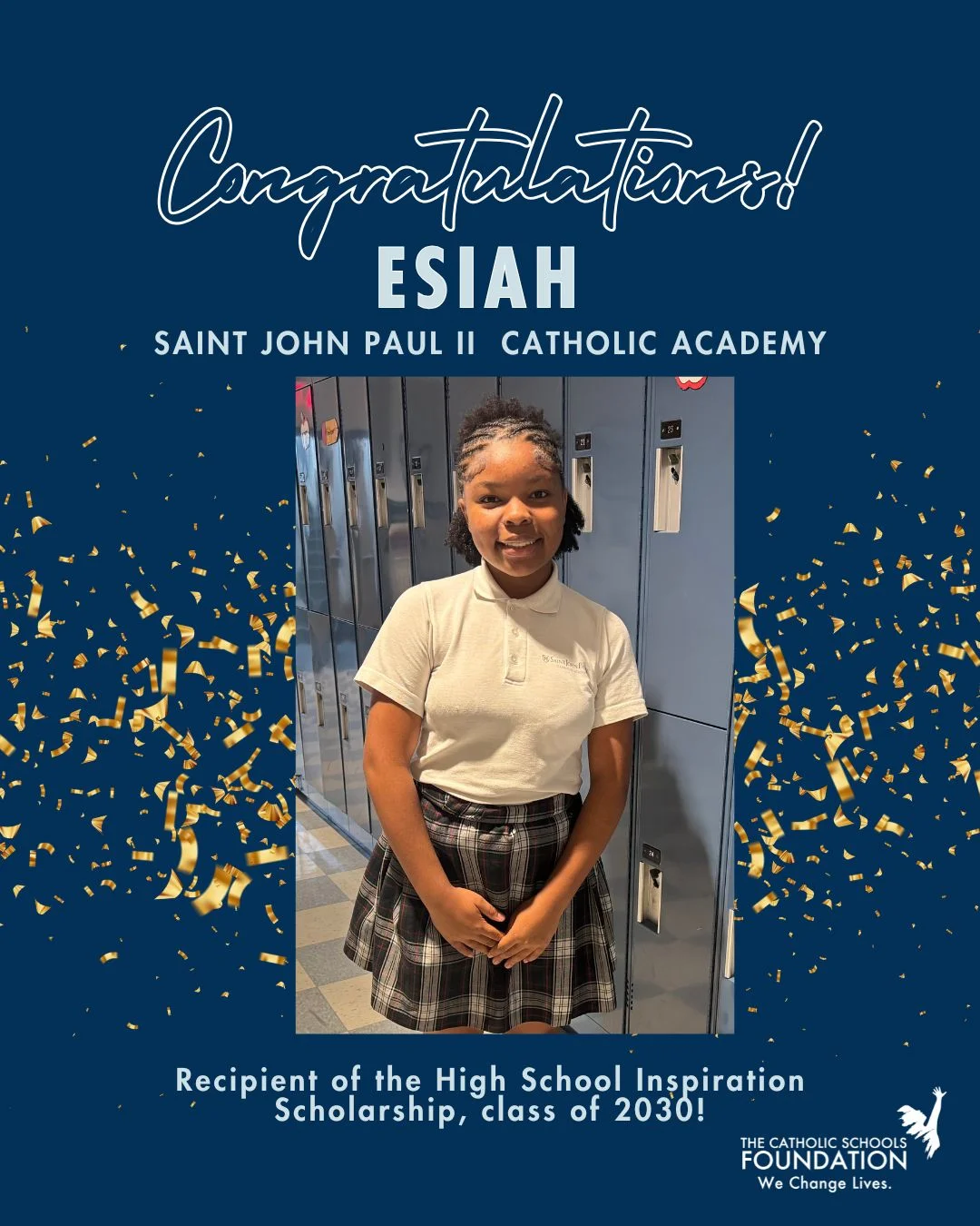 The Catholic Schools Foundation is honored to support students like Esiah—brilliant, compassionate, and determined young leaders who embody the true spirit of the Inspiration Scholarship. Congratulations, Esiah, on this incredible achievement and the bright journey ahead!